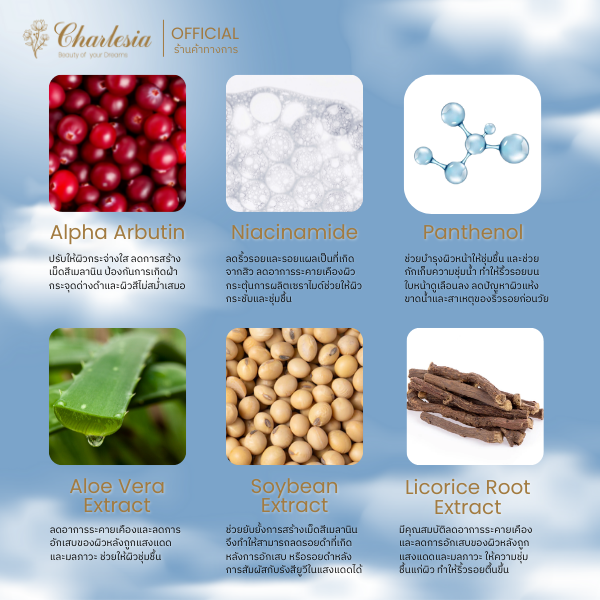 💧 Licorice Root Extract : มีคุณสมบัติลดอาการระคายเคืองและลดการอักเสบของผิวหลังถูกแสงแดดและมลภาวะ ให้ความชุ่มชื้นแก่ผิว ทำให้ริ้วรอยตื้นขึ้น ซึ่งนอกจากจะได้ผิวขาวใสแล้ว ยังช่วยดูแลริ้วรอยอีกด้วย
