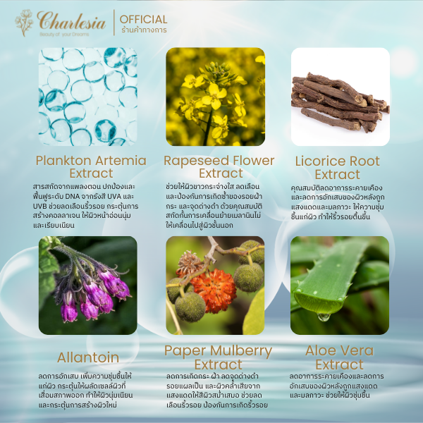💧 Plankton Artemia Extract : สารสกัดจากสาหร่ายทะเลสีน้ำตาล ปกป้องและฟื้นฟูระดับ DNA จากรังสี UVAและ UVB ช่วยลดเลือนริ้วรอย กระตุ้นการสร้างคอลลาเจน กระตุ้นการสร้าวผิวใหม่ให้ดูอ่อนนุ่มและเรียบเนียน